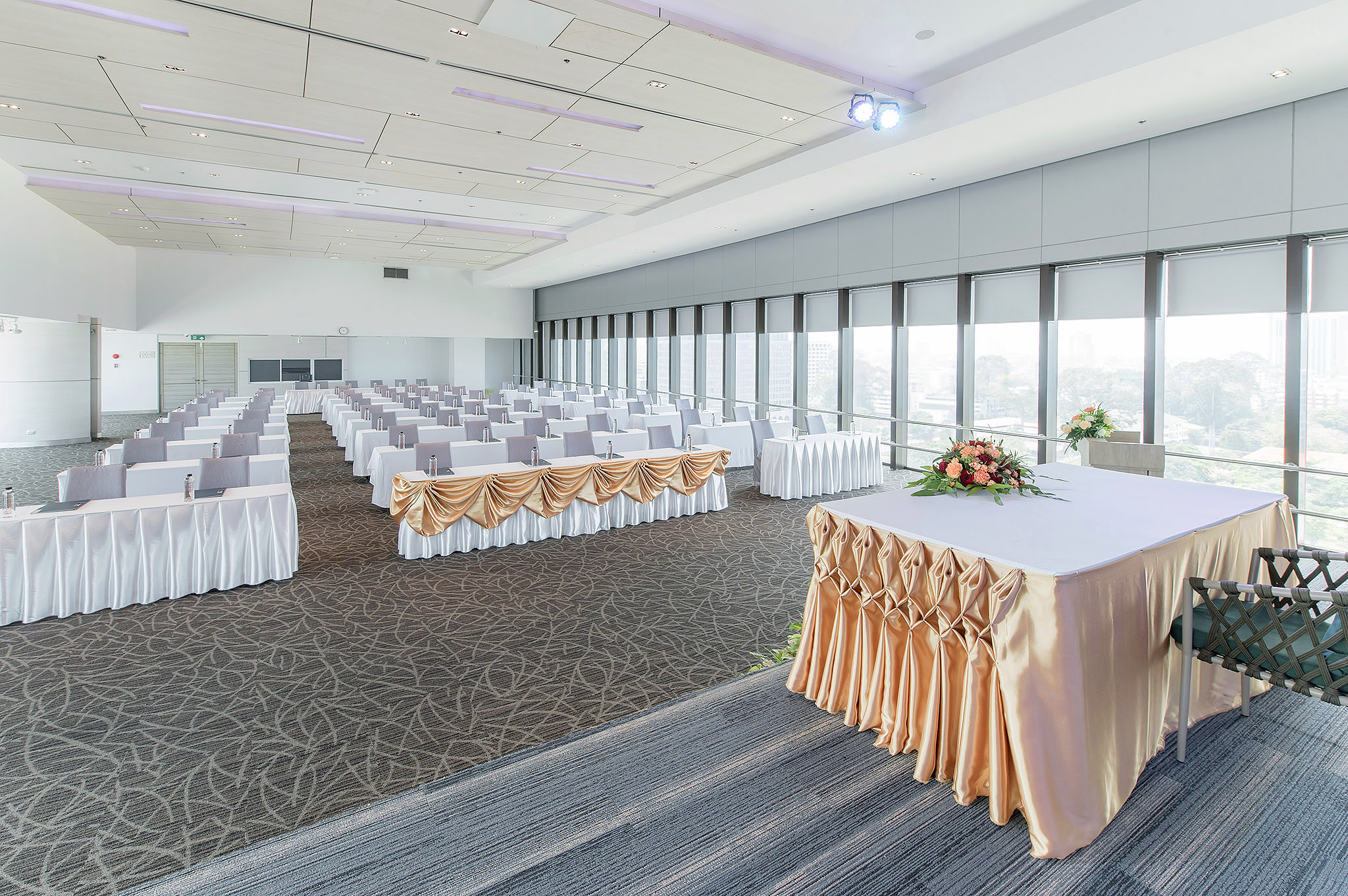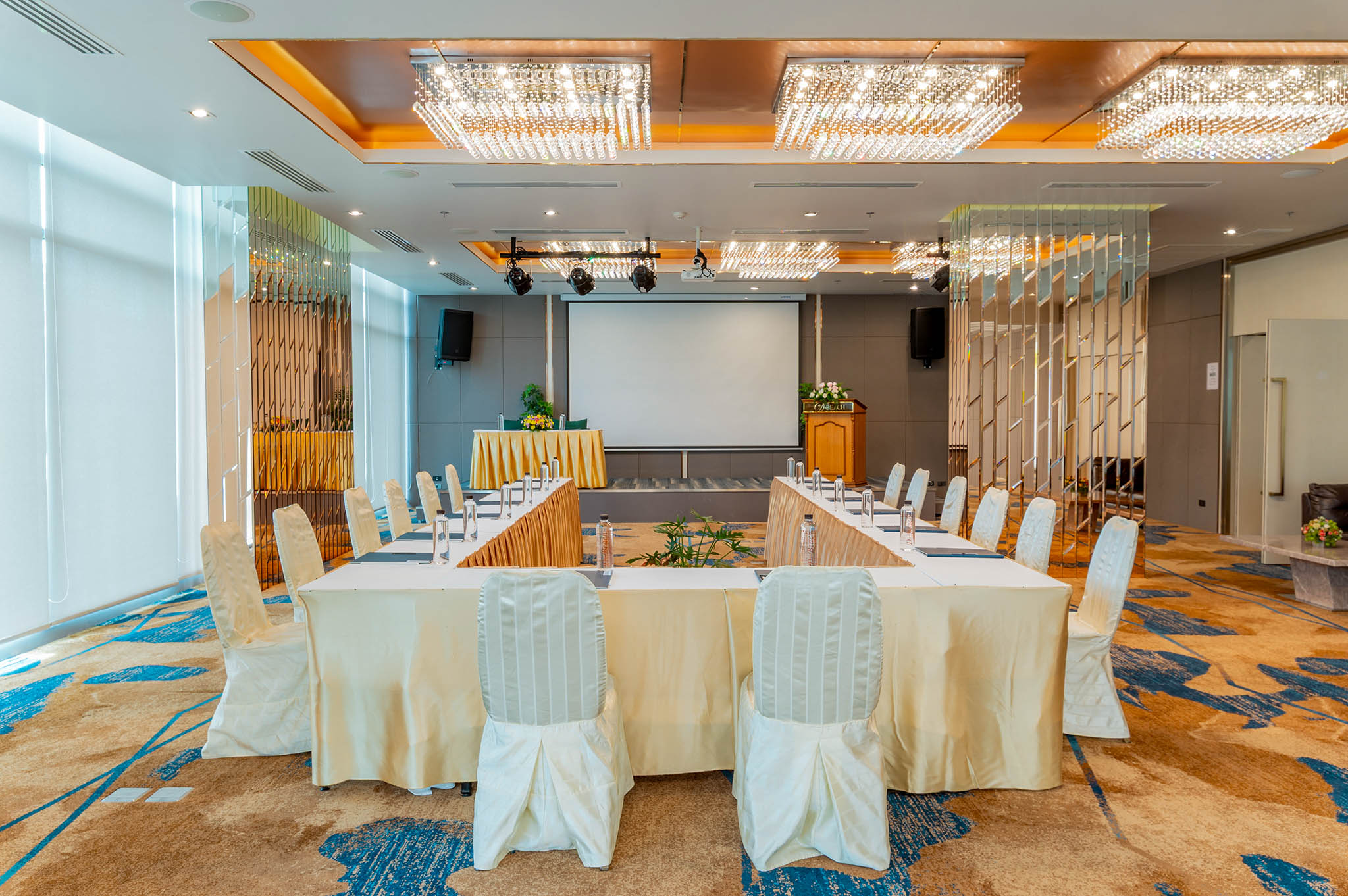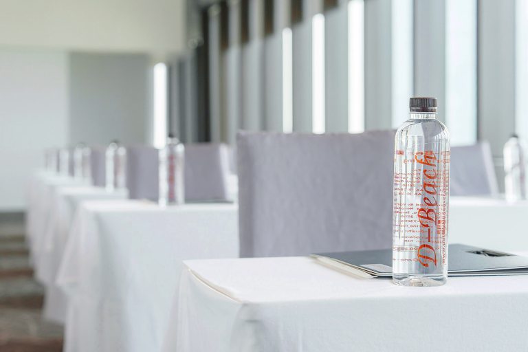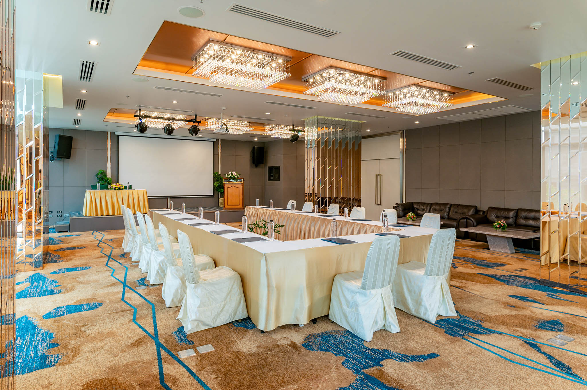 The DEE Meeting and Conference are located on the 2nd floor of the DEE Tower. It is decorate in a modern and luxurious interior with glass and copper design. This room has a corner where you can relax with a view of the swimming pool in front of the DEE Tower when you look out from the hallway of the meeting room.